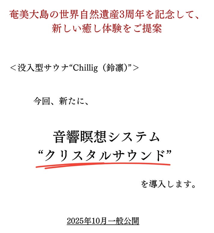 - 奄美大島の絶景サウナ付きヴィラに、新たに音響瞑想システム「クリスタルサウンド」を導入