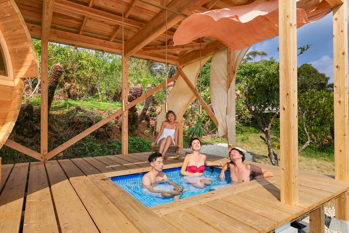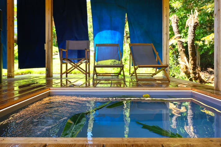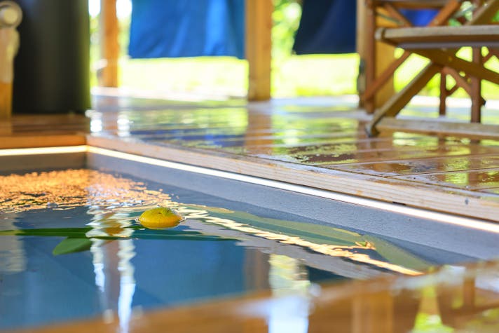 大人4人が同時に入れる大きめの “月桃(げっとう)” 入り水風呂。水温は約17℃~19℃に設定。