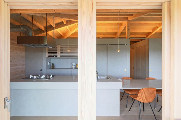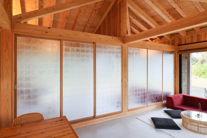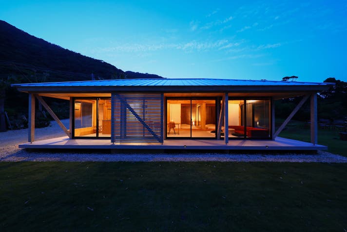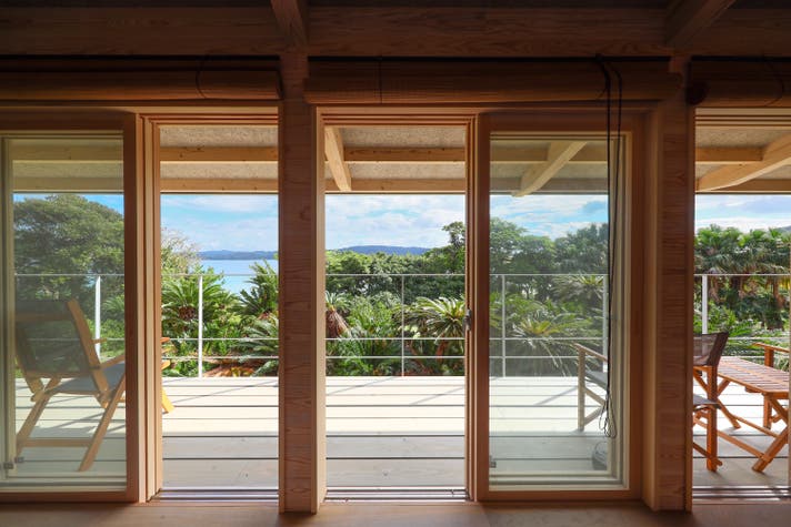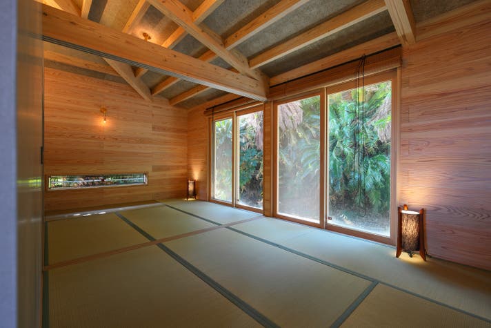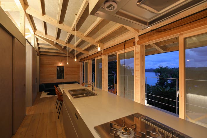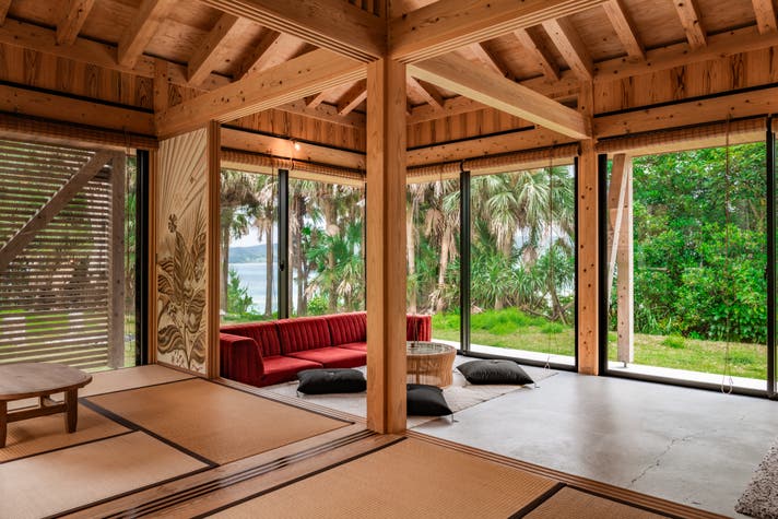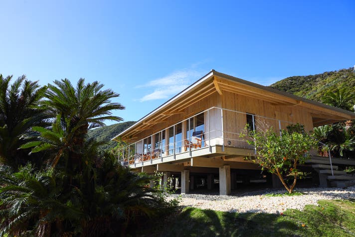 雄々しいソテツに囲まれ、海を見下ろす高床式が印象的。