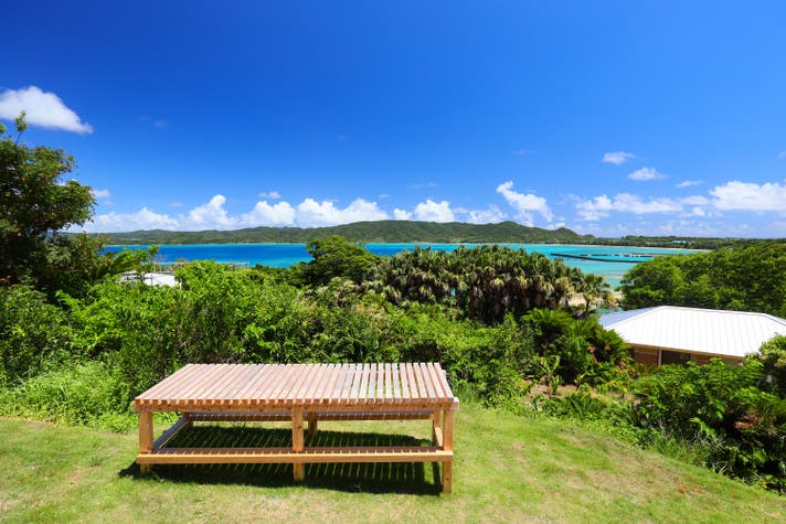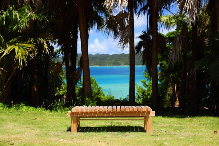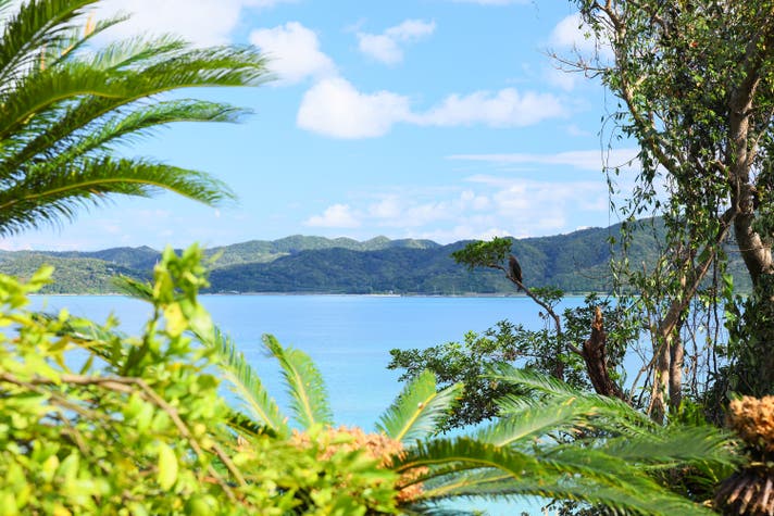 美しいビロウ樹の木々の間から見える海の景色が印象的。