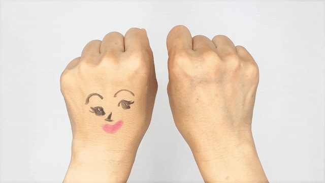 手の甲にメイクして洗顔料と水だけでTSURUSUBE DXでこするとスッキリ汚れが落ちました。メイクの汚れも、手首のクスミまで綺麗に汚れが落ちていることがわかります。