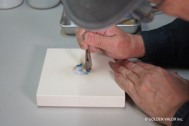 決定したデザインになるよう熟練の職人が絵付けを担当。腕時計の文字盤1枚1枚に丁寧に銀箔のデザインを施し、最後にコーティングを施します。このように銀箔や銀粉で文字盤をデザインします。