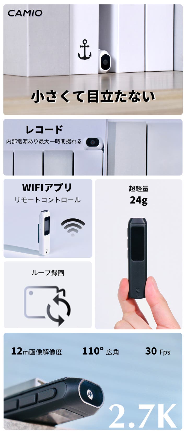最大 2.7Kの解像度で 30fps の動画を録画できます、110 度の超広角レンズにより、広い範囲を一望できる映像を作成できます。従来のウェアラブルカメラでは周辺の細節がボケがちだったり、暗所で画質が劣化したりしましたが、CAMIO は自動露出調整と ISO 制御機能により、それらの課題を解決しました。