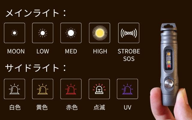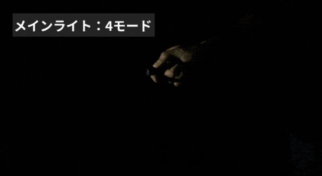 【メインライト】,【サイドライト】,【クイック点灯】の3つの基本モードを搭載しています。