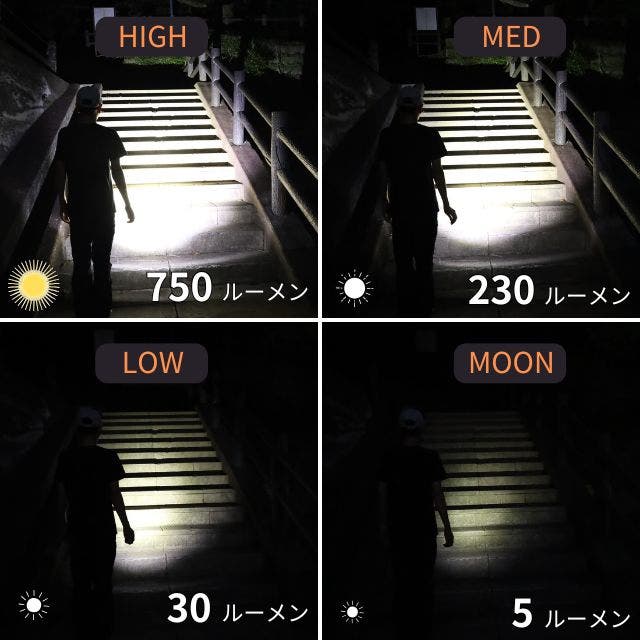 メインライトは、MOONライト(5ルーメン)、LOWライト(30ルーメン)、MEDライト(230ルーメン)、HIGHライト(750ルーメン)、の4モードにSTROBEとSOSモードを加えた6種類から選べます。