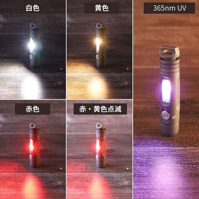 このモードでは、「白色」、「黄色」、「赤色」「点滅」,「UV」の5つモードから選択。夜間の作業、夜釣り、BBQの灯り、キャンプシーンだけでなく、非常時の警告灯として役立ちます。