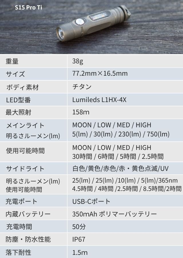 内容:チタン製小型LEDライトS15 Pro Ti×1個、バッテリー内蔵、USBケーブル(TypeA to C)、メタルリング、取扱説明書