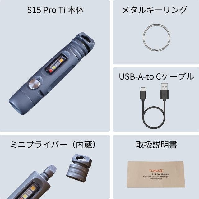 内容:S15Pro Titanium懐中電灯本体、ミニプライバー(内蔵)USBケーブル(TypeA to C)、メタルキーリング、取扱説明書