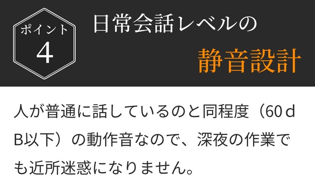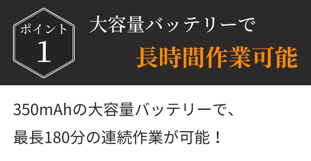 - バッテリー切れの心配なし! 持続力180分&静音設計で、効率的な作業且つ深夜作業も可能です。