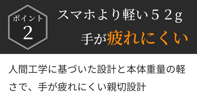 - 重さがたったの52gという軽量モデル。人間工学に基づいて造られているので持ち手の負担が少ない!