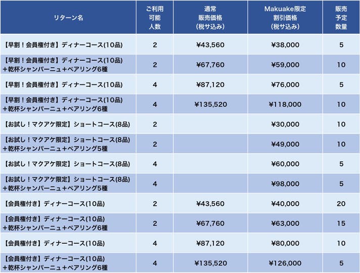 ・ディナーコース(10品) 2名様分 +Makuake限定会員権