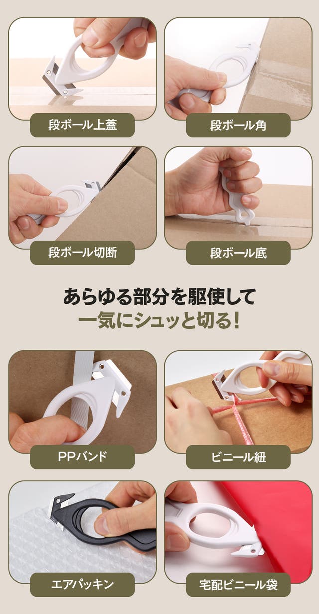- 開梱作業を怪我なく楽にする!究極に握りやすいセーフティー設計で誰でも使いやすい。