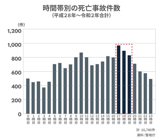 警察庁調べによると平成28年(2016年)から令和2年(2020年)までの5年間について、時間帯別の死亡事故の発生件数をみると、特に17時台、18時台、19時台の3つの時間帯が突出しています。