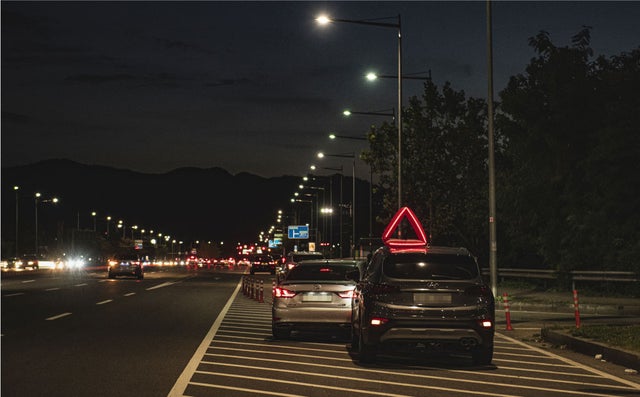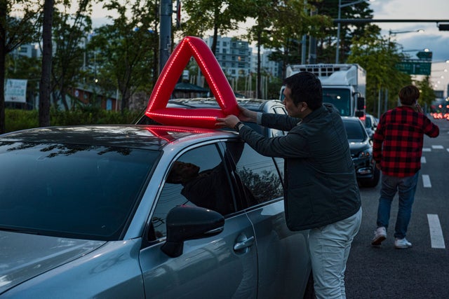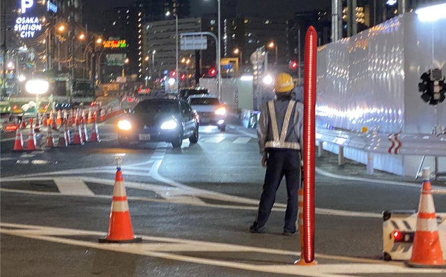 道路で車は絶え間なく続くため、下に置くタイプの三角表示板だけではすぐ後ろの車には見えてもその先の車には見えない場合があります。