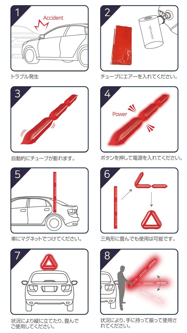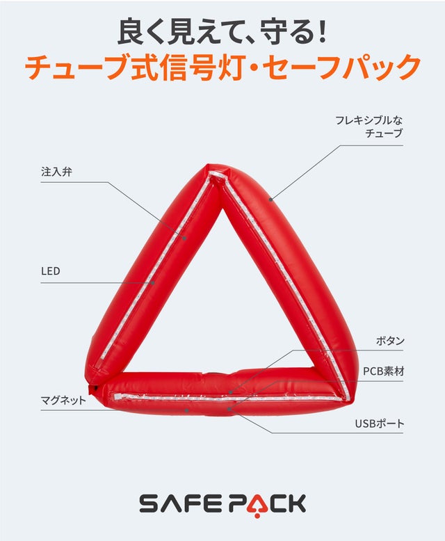 セーフパックはそういう場合にそれらを補うものとして、チューブタイプで簡単に使用できる信号灯です。