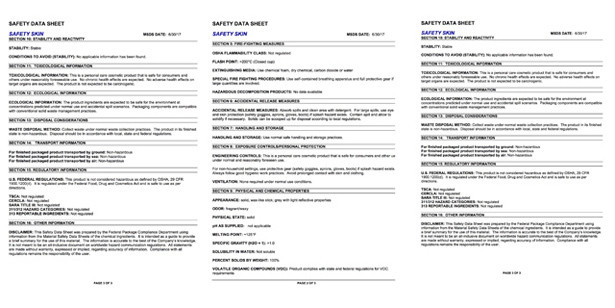 Safety Skinは7種類の成分で構成されています。皮膚コンディショニング剤、皮膚軟化剤、抗菌剤、結合剤、増粘剤、懸濁剤、反射剤とそれぞれの成分が製品の特性に寄与しています。