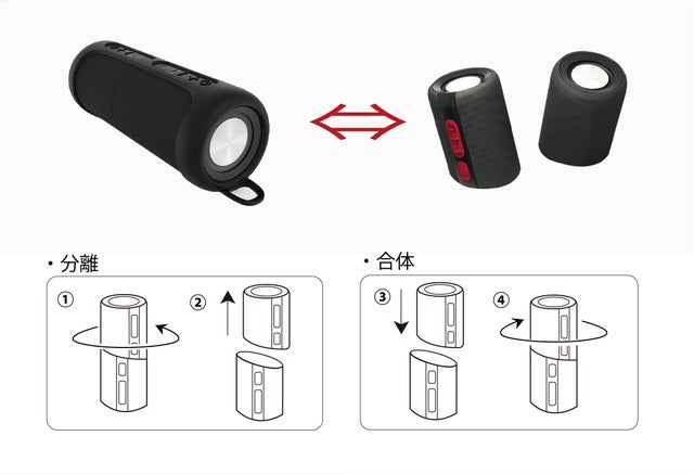また、一般のポータブルスピーカーは、決まった方向からしか音声が出ないのですが、こちらの製品は、分離して設置できますので、離れておくことによって、より臨場感のあるミュージックライフを楽しんで頂けます。