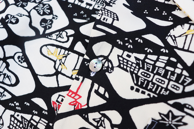 さらに、着物は使用する部分によって少しずつ微妙に柄が違っているので、皆さまの手元に届くアロハシャツは、すべて一点もの。