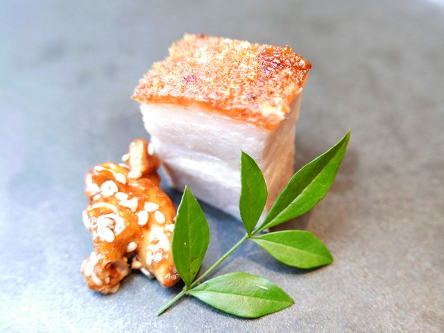菜香新館の前菜の代表といえばコレ!皮付きの豚バラを一枚まるごと窯で焼き上げていく料理。皮はサクサクで肉はジューシー、早々に売り切れてしまう人気前菜。