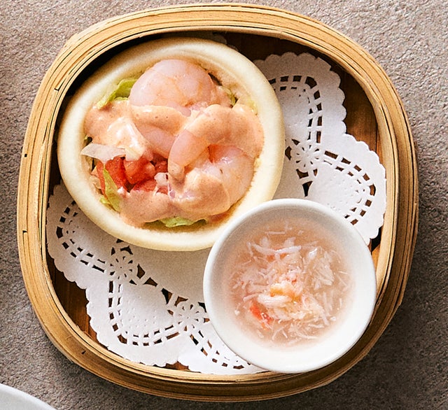 アフタヌーンティーで欠かせないメニューがサンドウィッチ。 菜香ではスパイシーなソースと海老をボウル型の生地でいただきます。