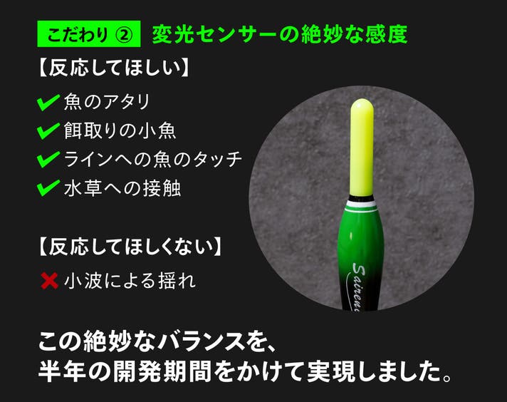 魚のアタリには反応するが、小波には反応しない絶妙なバランス。この調整に半年をかけ、5回のサンプル作成と実釣テストを繰り返しました。