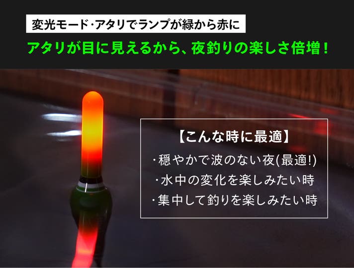 変光モードは、穏やかで波のない環境でパフォーマンスを発揮します。風が吹いたり波がある場合は、誤作動の可能性があるため、通常モード(緑ランプ常時点灯)での使用をおすすめします。釣り場の状況を見て、モードを使い分けることがこの3wayウキの醍醐味です。