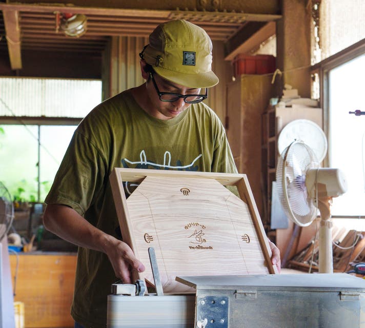 板を貼り合わせ組み立てたら、レーザー彫刻でデザインを施します