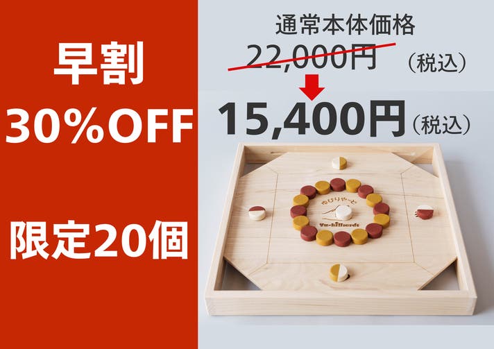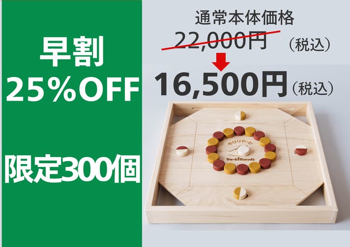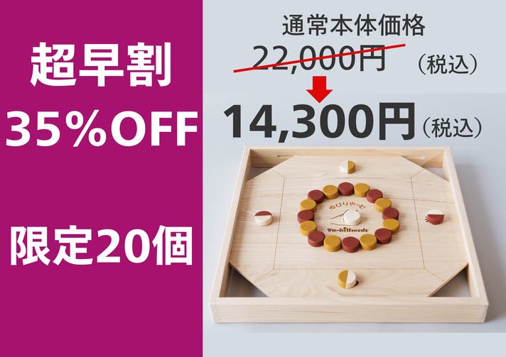 【注意】 ▶︎ 対象年齢3歳〜 本商品は駒が小さいため、誤飲しないようにお気をつけください。 特に、小さなお子様が遊ぶ際には、お子様から目を離さないようにお願い致します。 【商品について】 ・桐の性質上、傷がつきやすくなっていますので、ご了承ください。 ・また使用していくうちに、摩擦で盤に駒の色が移りやすくなりますので、ご了承ください。 ・顔料が混合されている柿渋ペイントは、変化はあまりないとされていますが、環境や使用頻度によって耐久性は変わります。 ・手作業のため個体差があり、写真と見た目が異なる場合があります。 【配送遅延とキャンセルについて】 本文中に記載させていただいたスケジュールは、あくまでプロジェクト公開時点の予定です。 応援購入の性質上、配送遅延のおそれがございます。 原則として、配送遅延に伴う応援購入のキャンセルはできませんが、リターン配送予定月から 3ヶ月 を超えた場合には、希望者に限りキャンセルにて対応させていただきます。 なお、予定数を上回るご注文を頂いた際には、一つ一つ手作りをする作品のため、お時間を頂戴することがございます。 【販売価格について】 ・リターンの割引価格については、限定数で決めさせて頂きます。 ・販売予定数が終了したら、次の割引価格に移行します。 ※適格請求書発行事業者登録番号なし インボイス(適格請求書):対応不可 【商品等の不具合による返品・交換】 原則として、サポーター都合によるキャンセル・返金は承っておりません。 (サポーター都合のキャンセル不可の例:誤注文、長期不在など) ◾️対応条件: 商品の初期不良、またはお届けした商品がご注文内容と異なる場合、到着後14日以内にプロジェクトページの「実行者にメッセージ」よりご連絡ください。状況を確認の上、返金対応、または良品との交換対応をさせていただきます。 ◾️返金額: リターン金額(税込)の全額 ◾️返品送料/再送料: 実行者負担 【返品・交換をお受けできない商品】 ・サポーターの責任により破損、汚損が生じた商品 ・商品のタグ、付属品、パッケージ(箱、袋など)を紛失、破棄された商品 ・事前にご連絡をいただいていない商品 ・商品到着後、15日以上経過した商品 【交換をお受けできないケース】 ・限定品や同一商品の在庫がない場合など、代替品をご用意できない商品