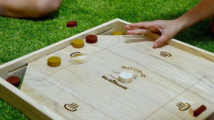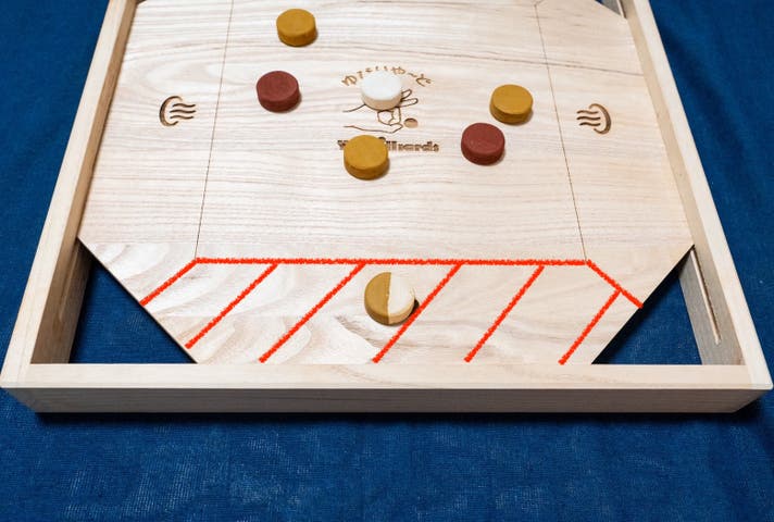 指で自分の持ち駒を弾き、コーナーに駒を落としていくボードゲームです