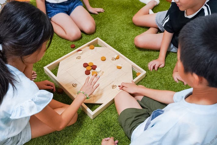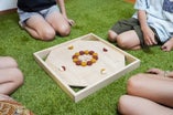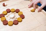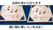 ※撮影時には中央のデザインが見えるように8個ずつ、合計16個の駒を円形に配置してますが、実際に遊ぶ際には6個ずつ、合計12個で輪を小さくしてください