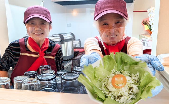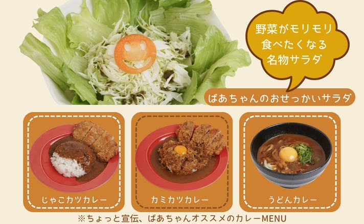 ばあちゃんたちから「カレーは辛口でたくさんのスパイスで元気になるよね。野菜も食べてもらってお客様を元気にしよう」と発案があり、サラダのサービスを始めました。お客様から「おばあちゃんのおせっかいな感じ思い出すなぁ。おっ何これウマいね!」これがばあちゃんの初めての企画でした。