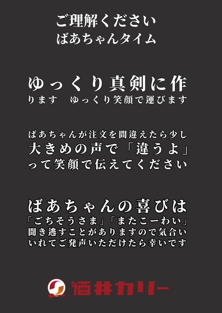 オープンを控えて研修を行うも「動きが遅いから・・・」「間違えたら・・・」「耳が遠いから・・・」「初めてのサービス業・・・」オープンが近づくにつれ不安は増すばかり。その不安な心の声をいっそのことお客様に伝えてしまおうとPOPを作成。