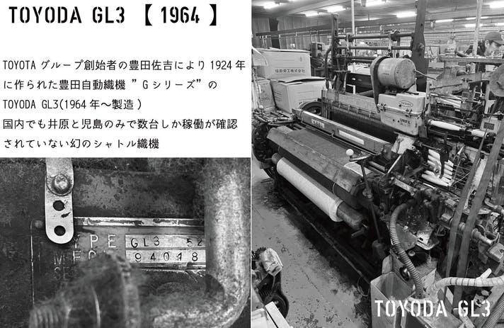 1950sの美しいタテ落ちを目指すために選ばれたシャトル織機が、豊田自動織機G型の中でも初期型で幻と言われている” TOYODA GL3 ”になります。