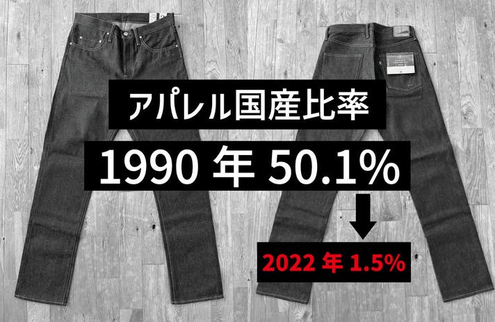 今では国産アパレルに巡り合うことが奇跡なくらい国内生産率は減少の一途をり、海外生産との価格競争や後継者不足などの問題を払拭できず、1990年50.1%→2022年1.5%にまで減少。