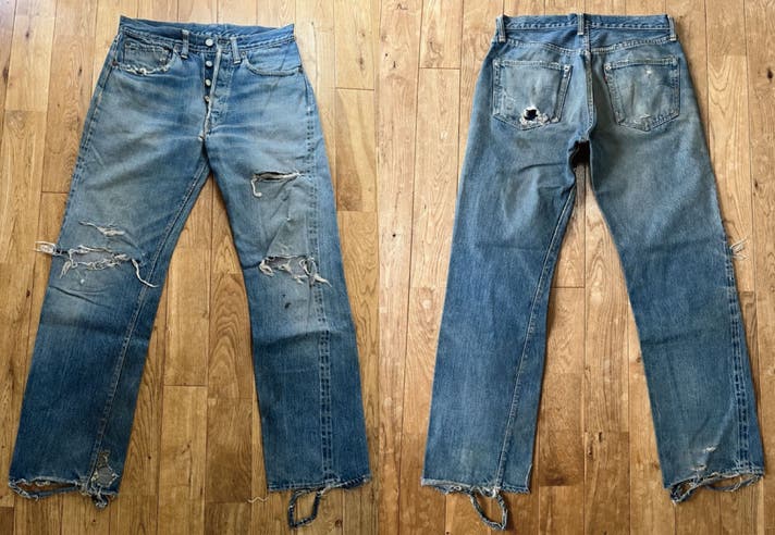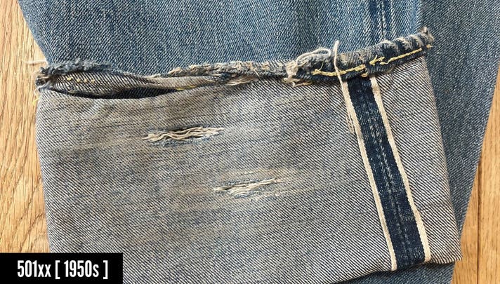 ジーンズ好きには周知の内容ですが、1946〜1966年まで某有名ジーンズブランドがデニムに最上位の品質を表すXX(EXTRA EXCEEDの略)をつけて販売していました。その中でも50年代のデニムの完成度が高く、細かな凹凸のシボとタテ落ちやフェード感などクオリティの高さが際立ちます。またこの当時のオンスは12.5〜14ozと言われるミッドウェイトです。