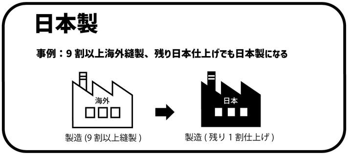 下記図のように一つの事例として、工賃の安い海外の縫製工場で9割以上を縫い合わせた後、国内に入れて縫製工場や加工場で最終の仕上げをすれば日本製になります。もし安価な日本製を見かけたら、大変な企業努力の賜物か上記事例の可能性が高いと考えられます。