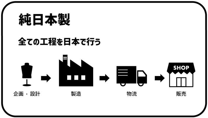 ※因みに純日本製とは下記図解のように企画・設計から製造、物流、販売まで全ての工程を日本でおこなった製品を指します。