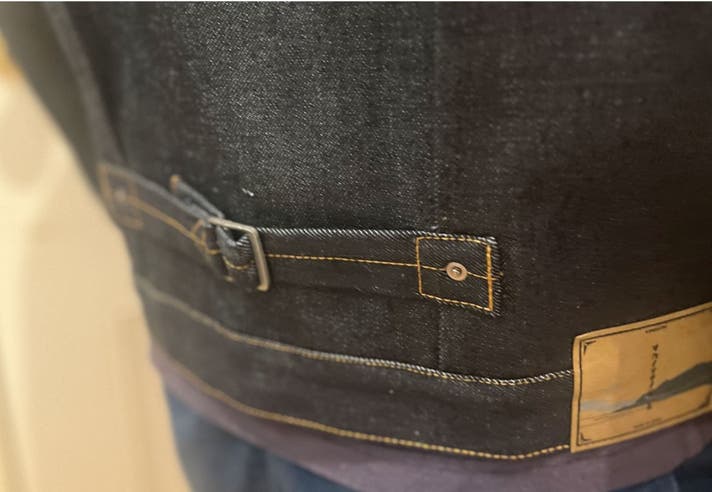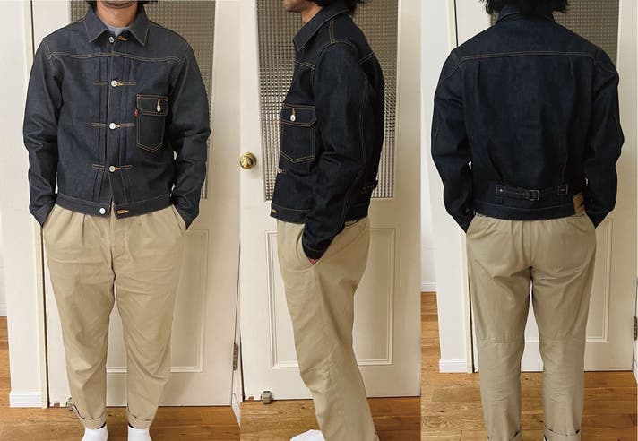 1st TYPEデニムジャケットは1936〜1952年まで製造されいたため、ジーンズと同じ1950年代の復刻デニム生地を使用していることもあり、1950年代のモデルを参考に製作しました。カフスボタンは内側にデザインされて、カフスとウエストベルト巾は40mmと細めに設定されています。因みに1953年以降2nd TYPEに切り替わるタイミングでカフスボタンは外側に位置され、カフスとベルト巾も45mmに変更されます。