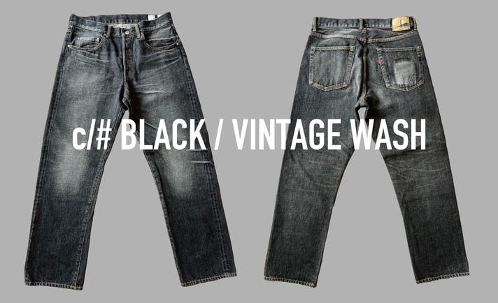 元々ブラックジーンズは1986年ごろに誕生したと言われており、デザインや縫製仕様も現行に近いモデル、またデニム自体セルヴィッジが無いため革新織機で製織されてたと推測できます。そのため立体感は少なくまたタテ落ちも鈍いです。今回使用するブラックデニムは1950年代を目指したデニムを再現しているため抜群のフェード感と風合いに仕上がってます。