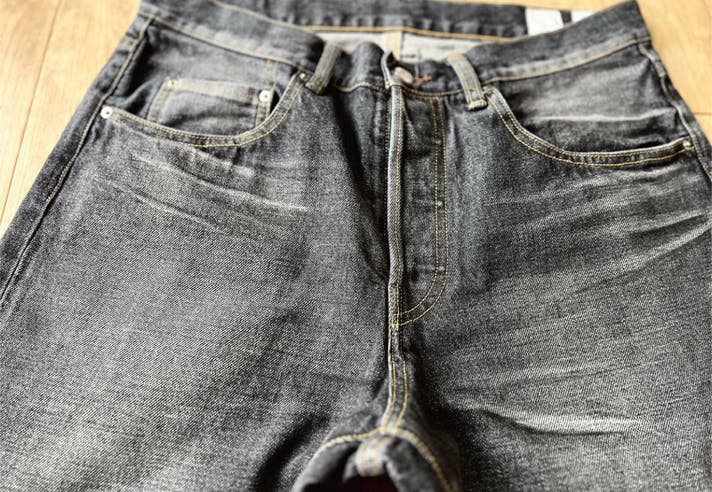 新色の先染めブラックが追加されました。後染めのベタッとしたブラックではなく、墨黒からグレーがかった経年変化が楽しめて、インディゴ同様にエイジングの過程で繊細なタテ落ちを表現します。