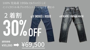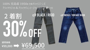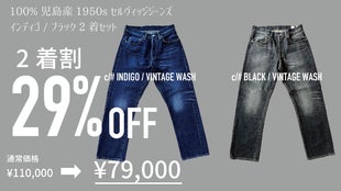 【2着割 限定30名様】セルヴィッジジーンズブラック(リジット) &インディゴブルー(ヴィンテージウォッシュ)1着ずつ【30%off】