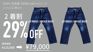 【2着割 限定30名様】セルヴィッジジーンズ(リジット) インディゴ&インディゴ(ヴィンテージウォッシュ)1着ずつ【30%off】