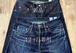 サカノシタノデニムのプロトモデルをリジット(新品)から着用12ヶ月。本物(1950s)のヴィンテージのようなタテ落ちやフェード感が現れてきました。