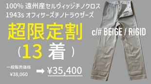 100%遠州産・セルヴィッジチノクロス 1943s USオフィサーズチノ 未洗い 1着