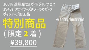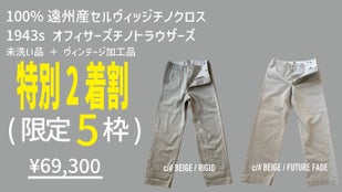 100%遠州産・セルヴィッジチノクロス 1943s USオフィサーズチノ 未洗い1着+洗い 1着