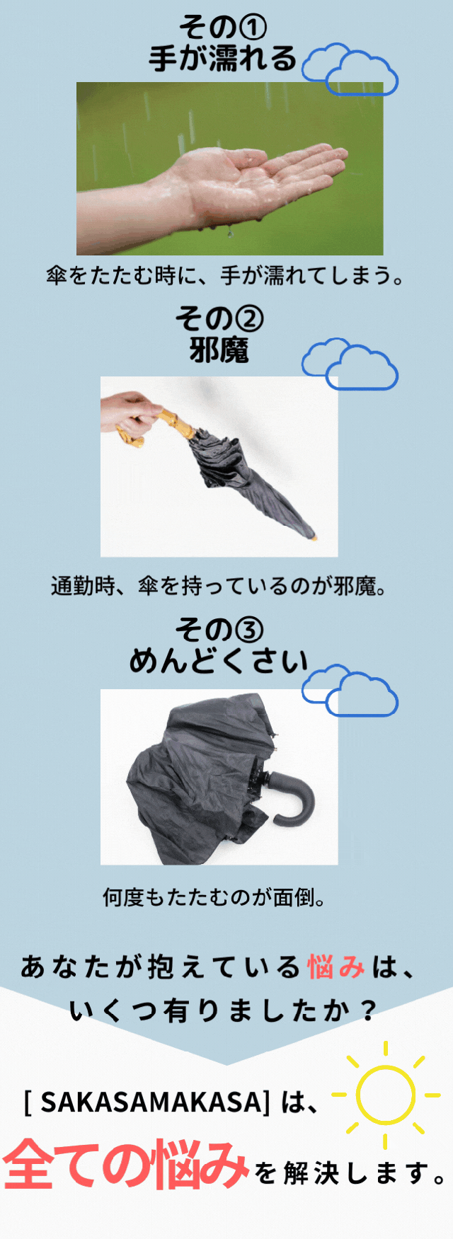 [SAKASAMAKASA]は、閉じた時に「傘の表面部分」が「内側に収納」されるように設計されています。収納時に手が濡れない・周りに水滴が跳ねにくいといった、革新的な折りたたみ傘になります。