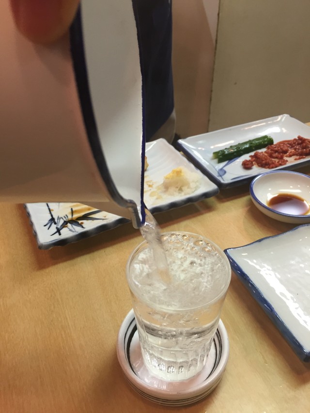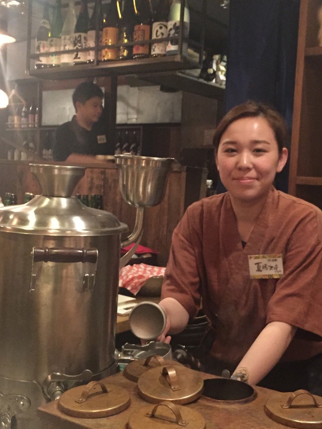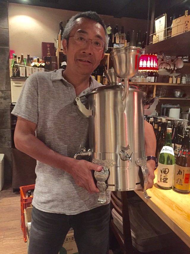 一升瓶から1合分をマグに移し変え、酒燗器の上部にあるジョウゴに注ぎます。酒燗器の中はお湯が沸いています。お湯の中に管がぐるぐる回っており、お酒がジェットコースターのように管の中を落ちていく間に温められます。下部の蛇口で温まったお酒を別のマグで受けます。マグのまま客席に持って行き、受け皿にのせたグラスにマグから泡立てるように注ぎます。