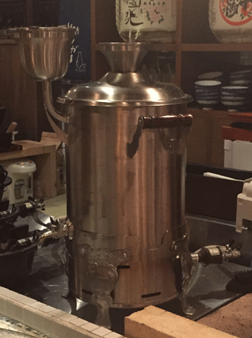 「昭和の酒燗器」とは、大きな鍋の中に管がぐるぐる回っている器具です。鍋でお湯を沸かして、管の上から日本酒を注ぐとお湯で温められて、管の下から燗酒になって出てくるという仕掛けです。瞬冷式ビールサーバーと同じ原理で、冷やすか温めるかの違いです。