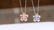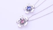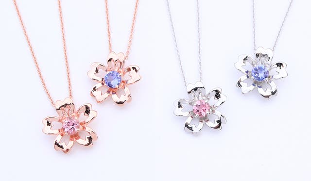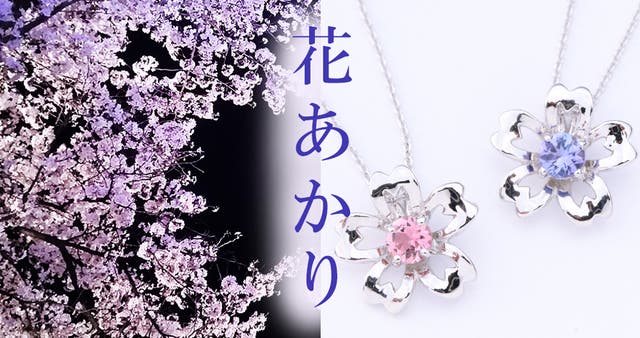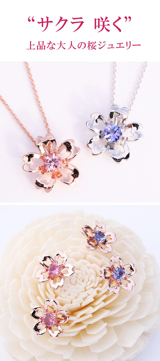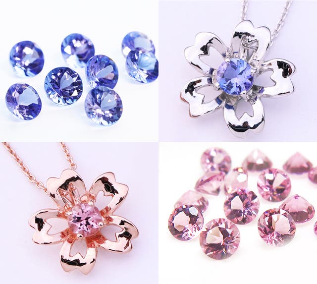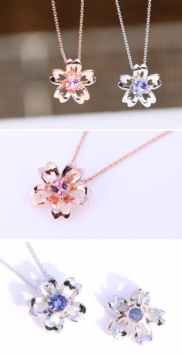 - 「紅色桜」と「白桜」に輝くタンザナイトとピンクトルマリンの可憐な美しさをお楽しみください。