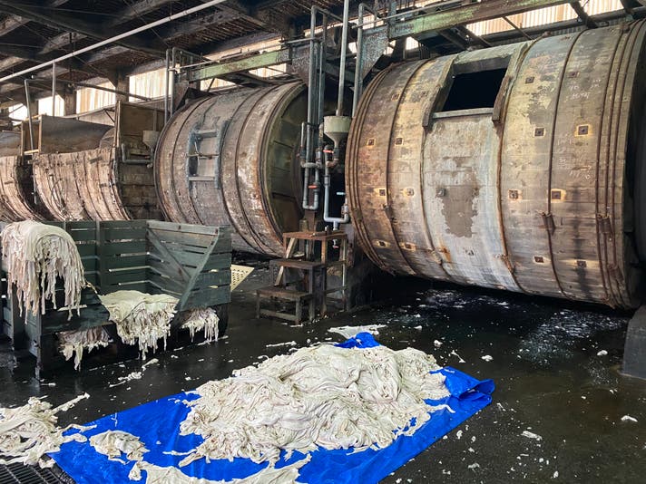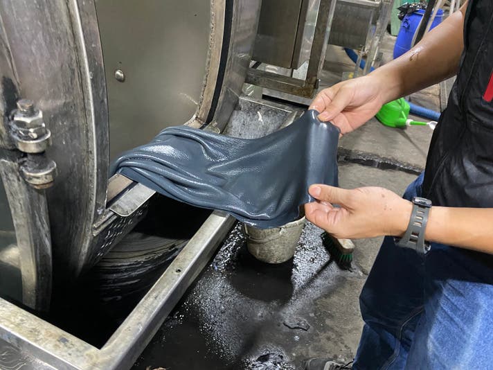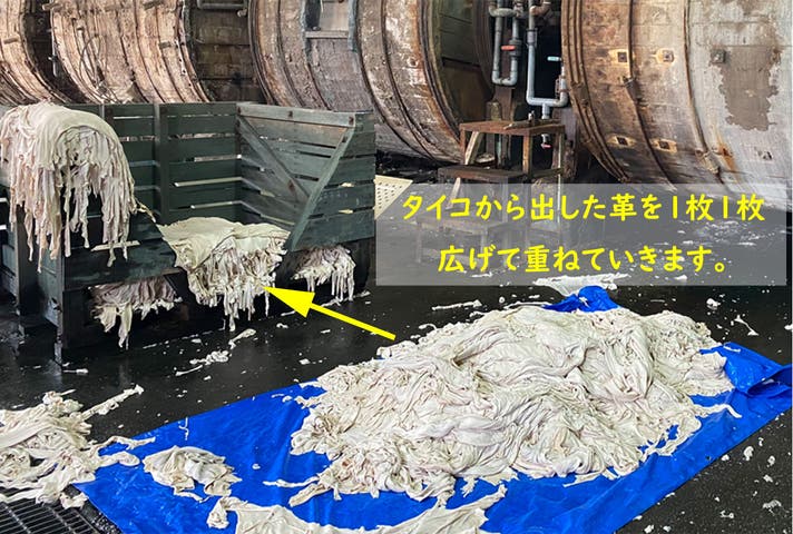 巨大な樽を横にした形の物体が「タイコ」もしくは「ドラム」と呼ばれているもので、この中に皮、水、薬品などを中に入れて一定時間かき回して皮から革へと変化します。こちらのタンナーさんでは有害な重金属、化学物質を使用しない独自に配合した無害ななめし剤を使用してなめしを行います。